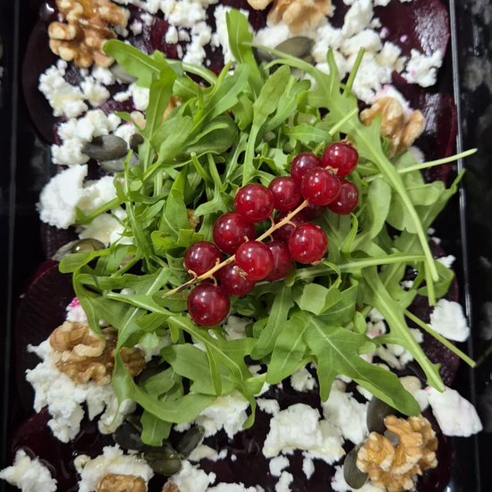 carpaccio van rode bieten, gegarneerd met geitenkaas, walnoten, pompoenpitten en rucola